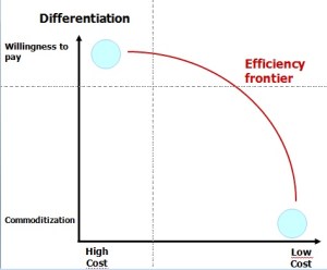 The efficiency frontier dictates that a company either serves the low end market by having low costs or the high end market but then has high costs. If a company isn’t on the frontier, it’s performing sub-optimally. But a business can beat the efficiency curve and face no competition by creating a blue ocean strategy – accessing a market not yet served by anyone.