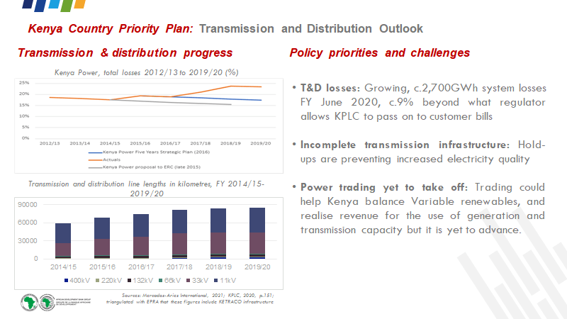 Starting with priorities that we identified, as the diagram at the top left shows, transmission and distribution technical and non-technical losses have been increasing, approaching a quarter of power generated. This obviously puts financial pressure on the power utility KPLC which is not allowed by the regulator to pass through the entirety of the cost of losses to end-consumers, while the Presidential Taskforce on the Review of Power Purchase Agreements has recommended that KPLC seek to reduce the tariff to end consumers by at least a third in the next four months.